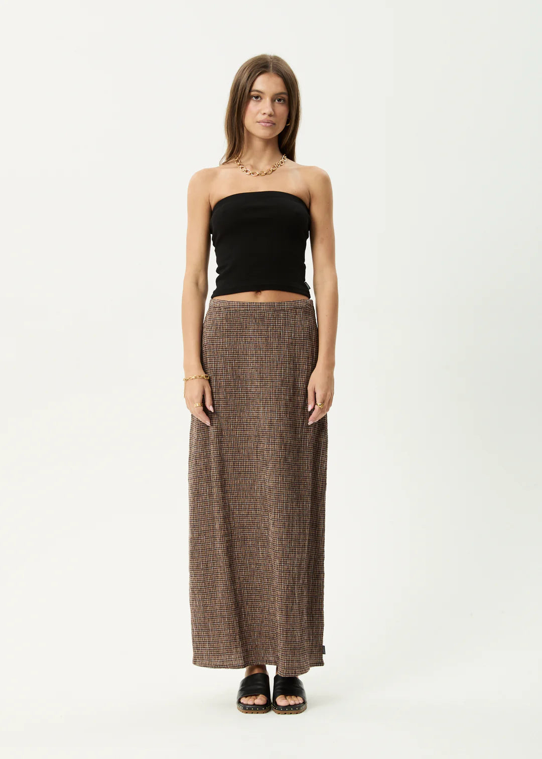 Your favourite check in a maxi skirt. This skirt offers an a-line skimming fit and invisible side zip while being made from hemp and tencel seersucker, providing a lightweight and textured feel.