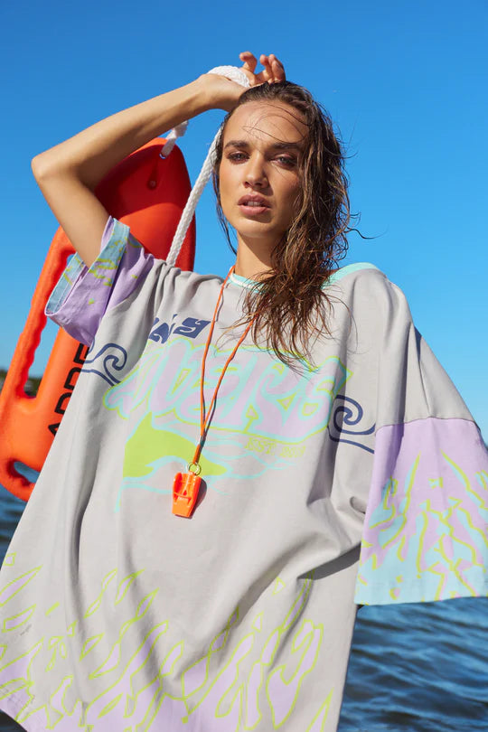Born from salt water and sun glare, the Wave Racer Tee is cut in our signature oversized fit and made from soft 100% cotton, bringing sun-bleached colour hits and 90s nostalgia into an easy, throw-on piece with main character energy.